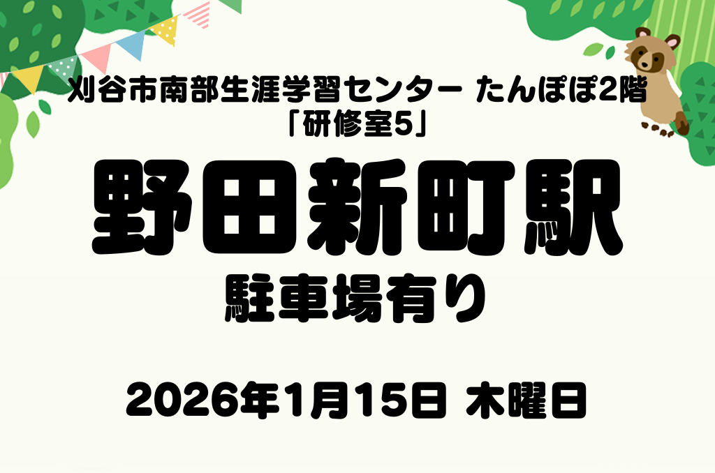 〒448-0803 愛知県刈谷市野田町西田7-2刈谷市南部生涯学習センター たんぽぽ2階